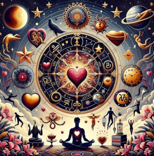 Im Zentrum des Motivs steht ein leuchtendes Herz, umgeben von einem komplexen Rad, das an Tierkreiszeichen, Planeten und kosmische Symbole erinnert. Flankiert von tanzenden Sternen, Himmelskörpern und in tiefer Meditation versunkenen Figuren, strahlt das Bild eine unglaubliche, positive Energie aus. Die Farben sind mystisch: tiefes Nachtblau trifft auf strahlendes Gold, warmes Rot und leuchtendes Türkis.